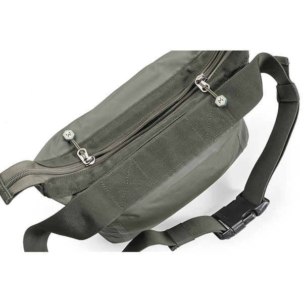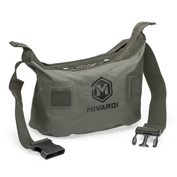 En vattentät förslutbar bältesväska med en bred justerbar midjerem och ett kraftigt bälteslås. Den är utformad för att fyllas med bete och sedan fästas runt midjan.