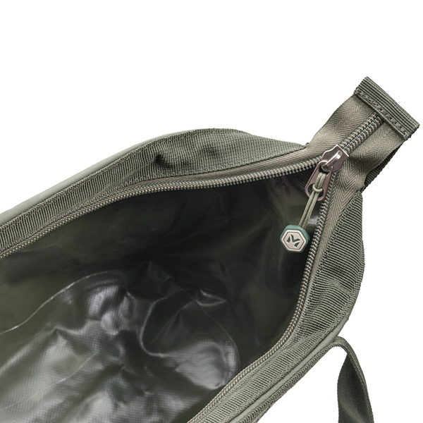 Väskan har en mycket slitstark 2-vägs dragkedja för enkel öppning och stängning och praktiska elastiska öglor på utsidan för att fästa en slangbella eller kaströr. Förstärkningarna som är placerade upptill håller formen på ett tillförlitligt sätt när de är öppna, vilket möjliggör enkel utskopning av bete.