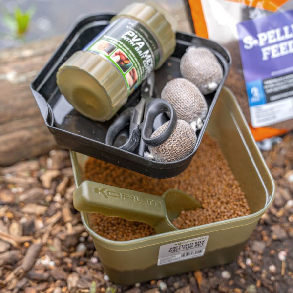 Korum Method Mix Bait Tub Set består av en 1,7 liters beteslåda, en kompakt foderskopa och en tillbehörsbricka. Ett perfekt kit för att blanda ihop små satser av pellets och groundbait. Perfekt för de kallare månaderna på året där stora mängder bete helt enkelt inte behövs. Foderskopan är verkligen praktiskt för att blanda beten och ladda upp din method mould för pressning.